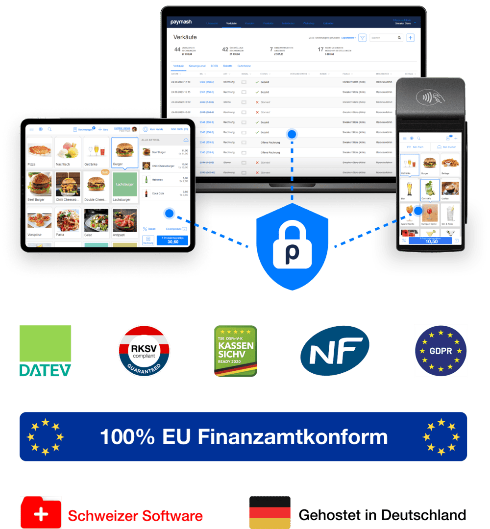 Paymash ist manipulationssicher und mit den europäischen Sicherheitsstandards konform. Mit automatischen Updates sind sie immer auf dem neuesten Stand. Ausserdem werden Ihre Daten lückenlos und unveränderbar gespeichert.