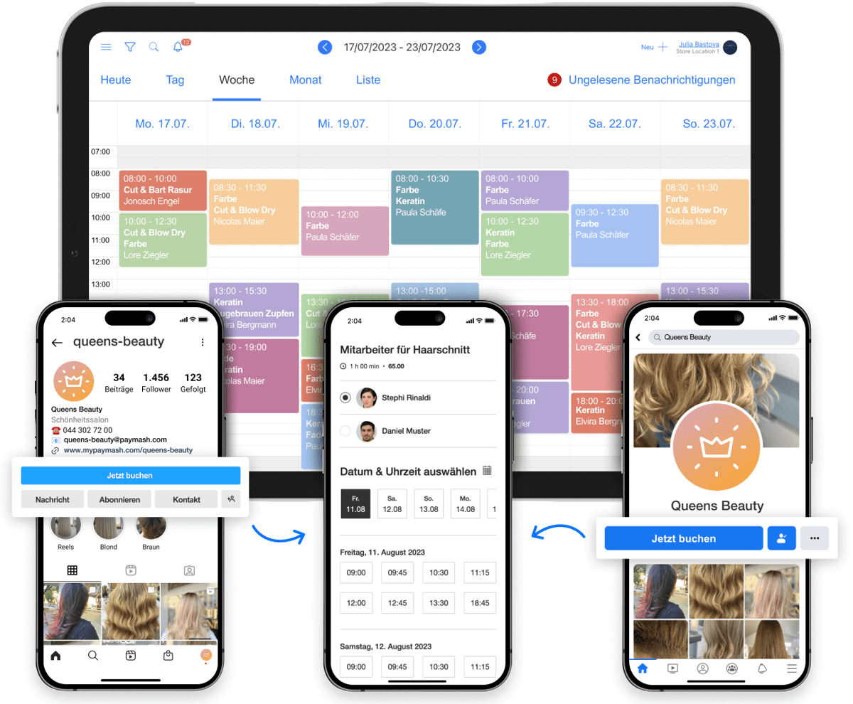 Mit dem Online-Kalender behältst du alle Kundentermine im Blick - im Geschäft, Zuhause oder im Urlaub. Deine Kunden können Termine rund um die Uhr über deine Webseite oder Instagram buchen. Paymash erinnert automatisch an den Termin.